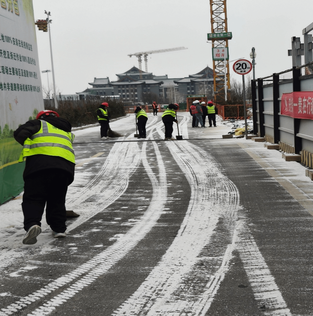 在大学堂、龙子湖实验大楼-信息科技研发大楼、国际科技合作大厦、科学展览馆等施工现场,检查人员聚焦雨雪天气施工安全,实地查看积雪清除及应对恶劣天气准备情况,叮嘱各参建单位管理人员筑牢安全意识,务必做到及时清理积雪、铺设防滑设施后方可作业施工,同时要加强对施工人员的生活关怀,做好一线人员的防寒取暖工作;针对高空作业等危险性较高的施工内容,要求施工人员严守操作规范,确保项目安全防护设施到位、施工人员安全装备佩戴齐全,不得冒险作业。同时还对临时设施及生活区用电、消防设施配备等情况进行了检查。